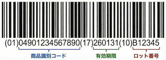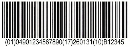 数字だけでなくアルファベットや記号も表現することができる1次元のバーコードです。 医薬品業界では、JANコードによる商品識別に加えて、ロット番号や有効期限も含める規格として採用されています。